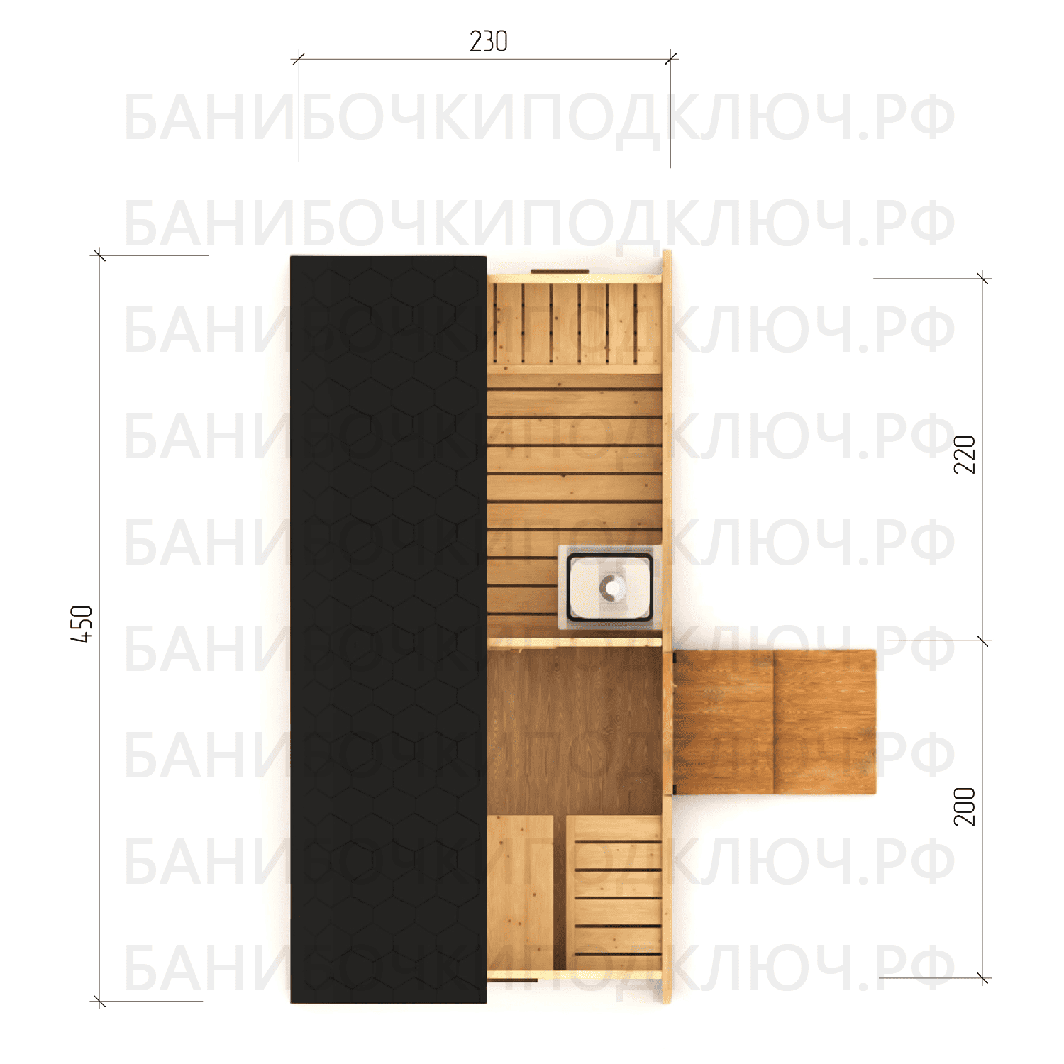 комната отдыха – 200х300, парная 180х220, мойка 120х220